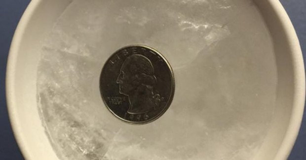 Sipajte vodu u šolju i stavite u zamrzivač da se zaledi. Kada u šolji ostane samo led, na vrh stavite i novčić i potom vratite u zamrzivač.