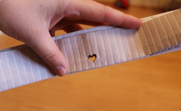 Kada napravite harmoniku od papira, izbušite rupu na sredini pomoću mašinice za bušenje rupa, ovde je u obliku srca, ali i uobičajene rupe će izgledati dobro. Uvacite konopac.
