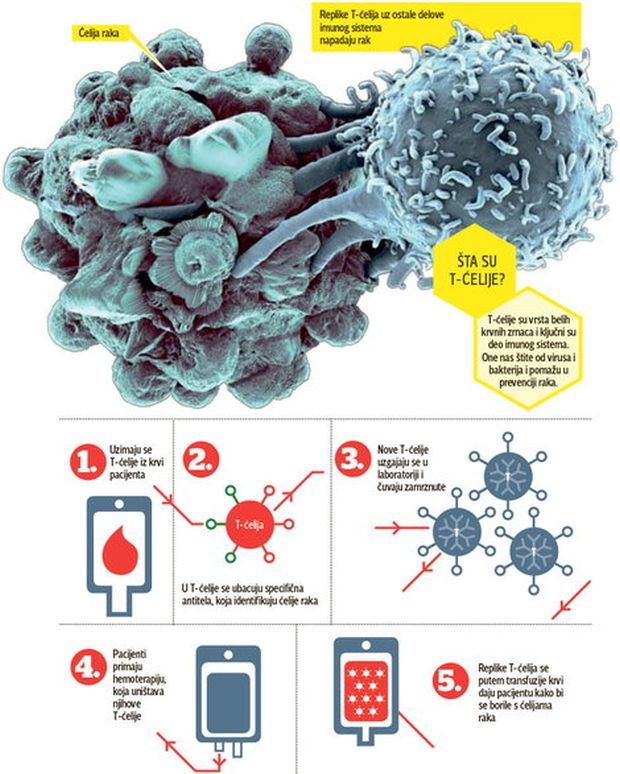 Prof. dr Vladimir Kovčin, onkolog KBC „Bežanijska kosa“, kaže za „Blic“ da se jedan oblik terapije T-limfocitima već primjenjuje, ali da je novina u unapređenoj sposobnosti prepoznavanja ćelija raka.
