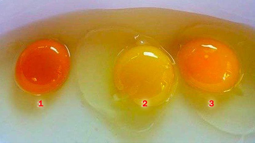 Na slici se prikazuje tri vrste žumanjaka. Broj 1 je vrlo taman narandžasti žumanjak, broj 2 je žuti žumanjak, a broj 3 je žumanjka svijetlo narandžast. Koje mislite da dolazi iz zdrave kokoške?
