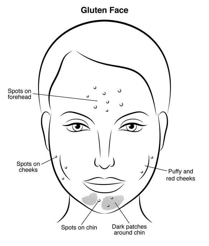 Tipični simptomi individualaca koji imaju intoleranciju na gluten su natečeni crveni obrazi i čeljust, nadut izgled, pigmentacija te prištići na bradi. Pretpostavlja se da je 15% ljudi osjetljivo na gluten kojeg najčešće obilježavaju natečeno lice i upalni procesi u tijelu.