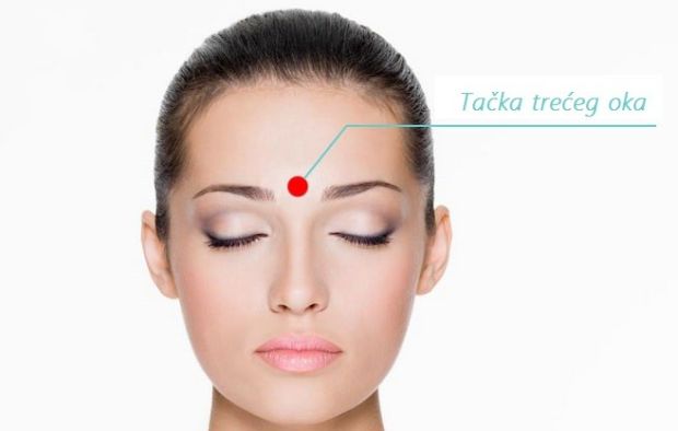 Da bi aktivirali tačku trećeg oka, potrebno je da zatvorite oči i sjednete u opuštenu poziciju. Stimulišite ovu tačku srednjim prstom i dlanovima, pritisnite tačku 1 minut i dišite duboko.