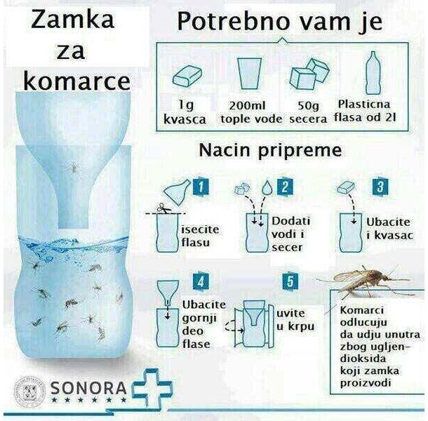 Boci isjecite gornji dio u vidu lijevka, kako bi od donjeg dijela ostala duboka posuda. Lijevak sačuvajte za kasnije. Donji deo boce oblijepite nečim crnim (crno privlači komarce). Zatim ugrijte vodu i u nju umješajte smeđi šećer da se rastopi. Kada se tečnost ohladi ulijte je u crno obloženu posudu, a po vrhu izmrvite kvasac. Sada u bocu ubacite lijevak koji vam je ostao od od gornjeg dijela boce, ali da lijevak ne dodiruje tečnost.