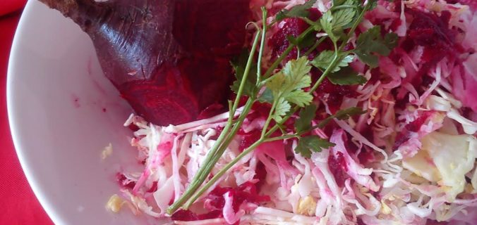 Izrendajte kupus, cveklu i šargarepu u razmeri 3:1:1. Dodajte malo začina po vašoj želji (peršun, celer), pa izmješajte povrće, ocijedite tečnost, pa prelijte salatu sokom od jednog limuna. Na kraju dodajte nekoliko kapi maslinovog ulja i vaš vitaminski obrok je gotov.