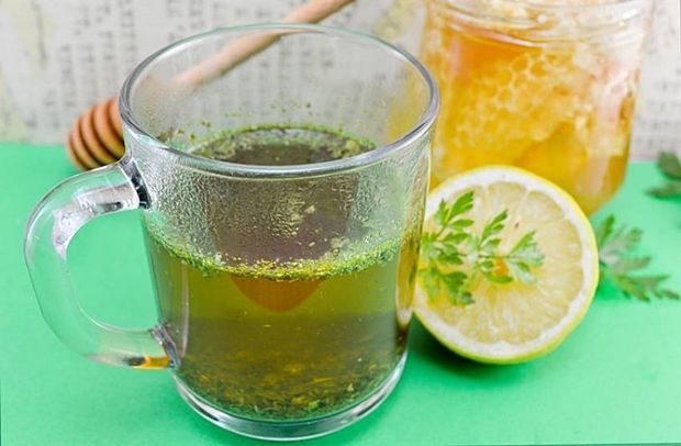 IscIJedite sok iz limuna i isJeckajte peršun. Stavite ih u šolju i preko prelijte vodu.