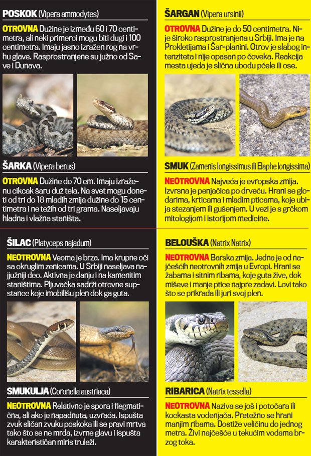 Nakon što je u autobusu „Niš ekspresa“ uhvaćena zmija dugačka oko dva metra, koja se čak jednoj putnici obmotala oko noge, samo nekoliko dana kasnije sličan stres preživio je i Vranjanac koji je u automobilu zatekao ozloglašenu otrovnicu – poskoka. Još jedna zmija izazvala je nedavno paniku na autobuskoj stanici u Beogradu izmilevši iz jedne torbe. Ovi gmizavci primećeni su i u blizini škola i vrtića, pa su učestali pozivi komunalnim i specijalizovanim službama.