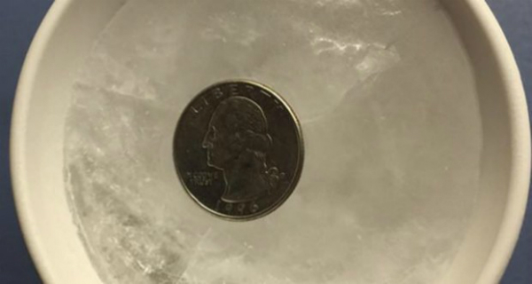 Sipajte vodu u posudu i staviti u posudu da se zamrzne. Onda na zaleđenu površinu postavite metalni novčić i vratite posudu u zamrzivač.