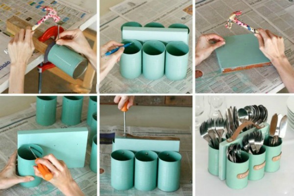 Uzmite stare konzerve (poželjno je da budu dublje) i ofarbajte ih u željenu boju. Dok se konzerve suše, uzmite parče drveta i takođe ga ofarbajte u željenu boju. Nakon što se sve osuši, ekserom pričvrstite konzerve za dasku, a na vrhu zakucajte mali držač, koji će vam služiti za lakši prenos ovog novog držača.