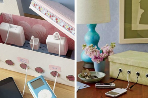Pronađite ukrasnu kutiju, koja sa strane ima otvorene krugove ili ih sami napravite uz pomoć noža. U kutiju stavite produžni kabl i u njega uključite sve punjače koji su vam potrebni, dok ćete kablove provući kroz zasebne rupe. Iznad svakog otvora napišite gdje je čiji punjač i više nećete morati da tragate za punjačem, niti će bilo ko uzimati vaš.