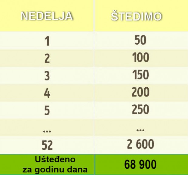 Na primjer, počnite od 50 din. Sljedeće nedelje odvojite 100, potom 150, a posljednje nedelje u godini 2 600 din. Na kraju ćete uspjeti da sakupite 68 900 din.