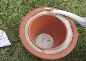 Malu saksiju stavite u veliku, a između njih naspite pijesak. Pijesak zalijte hladnom vodom. Sačekajte 10-ak minuta i onda stavite pića i naravno stavite poklopac preko.