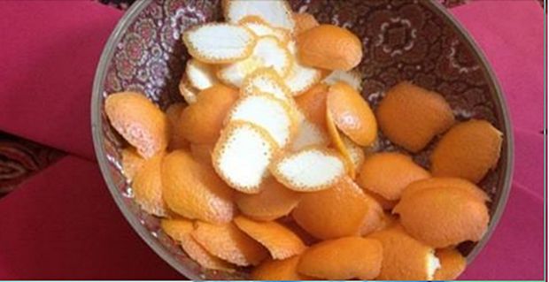 - Ogulite naranče, uzmite koru, a plodove ostavite za jelo. Podijelite koru svake naranče na 9 komada. Stavite ih u zdjelu i prelijte vrućom vodom do 3/4 zdjele.