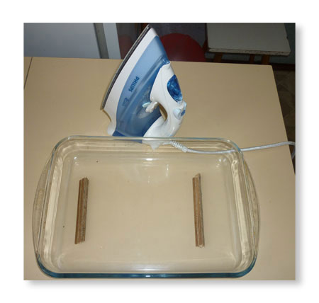 Uzmite sud otporan na toplotu , koji imate u kući, stavite na njegovo dno dva drvena štapića, na koja ćete staviti peglu.