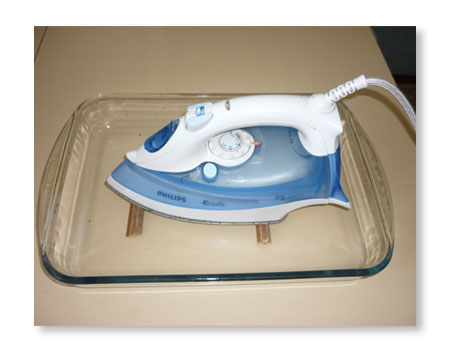 Prije nego što počnite čišćenje pegle na ovaj način, pripremite sud otporan na toplotu (tepsiju, đuvec, široki tiganj, vatrostalnu činiju) u koji možete smjestiti svoju peglu. Takođe će vam trebati dva drvena štapića, na koji ćete staviti peglu, tako da između pegle i dna posude napravite razmak oko 1 cantimetar. Tako je najlakše očistiti peglu.