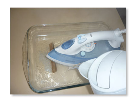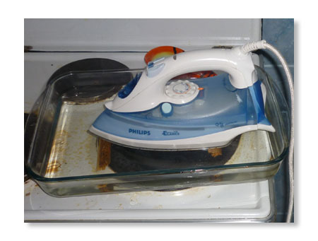 Voda treba da pokriva grejnu ploču pegle na 1-1,5 centimetar. Svi gumeni i električni dijelovi treba da se nalaze iznad vode. Pegla je naravno isključena.