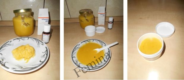 U manjoj posudi dobro promiješajte nevenovu mast i vitamin A (ili vitamin AD – uljne AD kapi) u odnosu 2:1, dva dijela nevenove masti i jedan dio vitamina A. Mast nevena i vitamin AD možete kupiti u apoteci (ja sam koristila domaću nevenovu mast). Znači, 20 gr masti i 10 ml Vitamina A (ili AD).