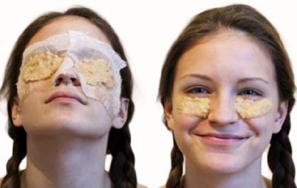 Izrendani krompir stavite na pripremljene komadiće gaze (po 1 kašiku na svako parče gaze) i ovu masku nanesite na područje oko očiju, tako da gaza stoji povrh krompira.