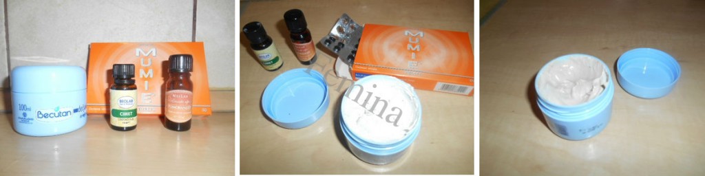U teglicu (ne manju od 150 ml) staviti 100 gr dečje kreme. Zatim dodati 5-6 u prah isitnjene tablete mumijo i promiješati. Tablete mumijo držite u frižideru, lakše se istisnu i isitne. Dodati 20 kapi narandžinog (ili drugog citrusovog ulja) i ne više od 5 kapi ulja cimeta.