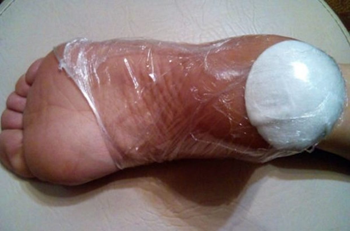 Oblog staviti na petu (žuljeve, stopala) umotati najlonskom kesom i obuti čarapu. Ostaviti preko noći.