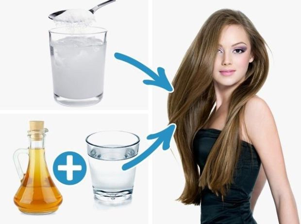 Pomiješajte 9 supene kašika vode i 3. supene kašike sode i nanesite smjesu uz pomoć bočice s aplikatorom na cijelu dužinu i na korijen kose, i potom malo masirajte. Onda nanesite rastvor od vode i jabukovog sirćeta, opet promasirajte i isperite. Ovaj rastvor će učiniti kosu sjajnom i zdravom.