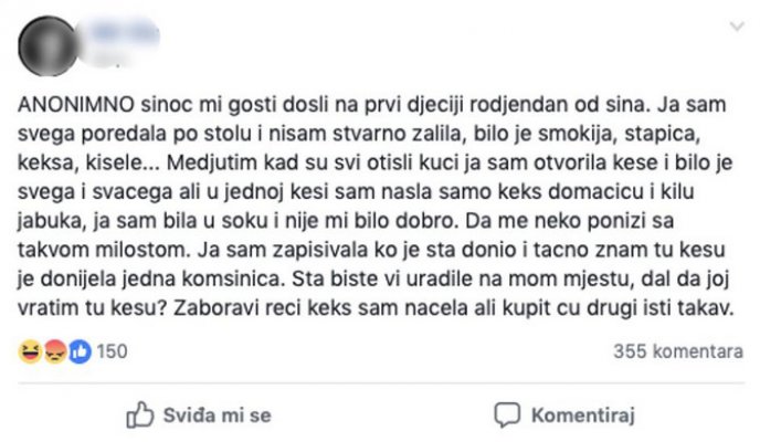 “ANONIMNO: sinoć mi gosti došli na prvi dječji rođendan mog sina. Ja sam svega poređala po stolu i nisam stvarno žalila. Bilo je smokija, štapića, keksa, kisele… Međutim, kad su svi otišli kući, ja sam otvorila kese i bilo je svega i svačega, ali u jednoj kesi sam našla samo keks Domaćicu i kilogram jabuka. Ja sam bila u šoku i nije mi bilo dobro. Da me neko ponizi s takvom milošću. Ja sam zapisivala ko je šta donio i tačno znam da je tu kesu donijela jedna komšinica. Šta biste vi uradile na mom mjestu, da joj vratim kesu? Zaboravih da kažem i : “keks sam otvorila, ali kupiću drugi isti takav”, stoji u objavi na Facebooku.