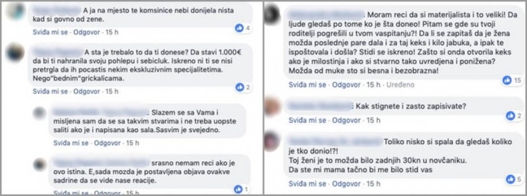 “Znači strašno… Jesi li možda razmišljala o tome da ta osoba nema novca pa nije nešto više kupila ili? Jadno je da u 21 vijeku ljudi gledaju ko je šta donio… Sorry, ali meni je ovo fuj…”, “Toliko nisko si spala da gledaš koliko je ko donio!?! Toj ženi je to možda bilo zadnjih 30 kuna u novčaniku. Da ste mi mama tačno bi me bilo sramota od vas” i “Možda je žena imala para za to, nije poklon bitan, nego da se djeca zabave. Kako vas nije sramota kao majku tako da razmišljate”, samo su neki od komentara žena koji su se našli ispod ove objave.