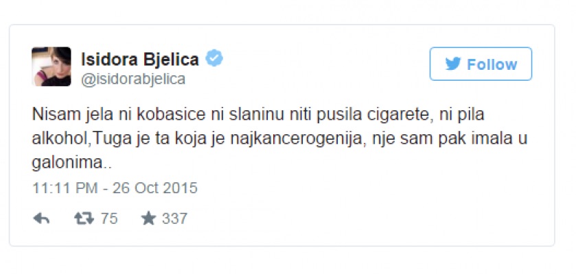 Nakon što je 2015. godine svijet šokirala informacija da je Svjetska zdravstvena organizacija slaninu, kobasice, i druge mesne prerađevine proglasila za kancerogene, tada se oglasila i Isidora Bjelica, koja je na svom Tviter profilu navela šta misli o cijeloj ovoj priči.