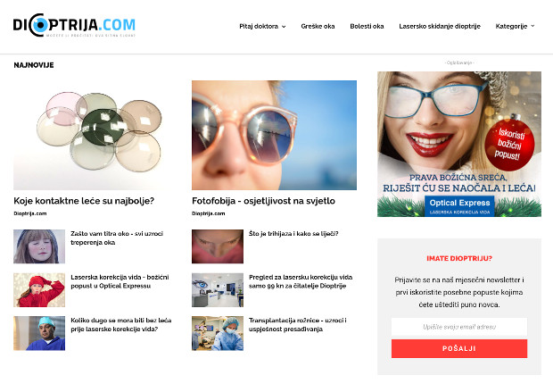 Dioptrija.com portal za sve one koji imaju problema s dioptrijom i očnim zdravljem. Na portalu možete pročitati korisne savjete i informacije o bolestima oka, greškama oka, laserskom skidanju dioptrije te i zanimljivosti o utjecaju raznih životnih stanja na zdravlje očiju. Na Dioptrija.com portalu možete saznati koje leće su najzdravije za oči, kako održavati dioptrijske naočale, što pitati doktora na oftalmološkom pregledu, a ukoliko imate bilo kakvo pitanje o zdravlju očiju, na pitanja će vam odgovoriti stručnjak za zdravlje očiju dr. Dean Šarić iz klinike Optical Express.