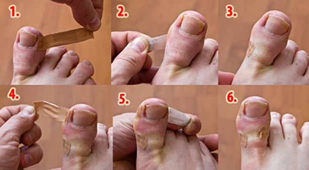 2. Zatim pokušajte da odvojite ćošak uraslog nokta. Da biste olakšali ovu bolnu proceduru, uzmite komad flastera i jednom stranom zalijepite ga dobro na bočnu stranu prsta pored uraslog nokta, povucite ga u stranu i zafiksirajte na unutrašnju površinu nokta. Tako će ćošak bolnog nokta postati pristupačniji.