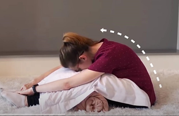 Sjedite na pod i ispružite noge. Neka razmak između stopala bude od 5 do 10 cm. Urolano ćebe ili peškir stavite ispod koljena, a jastuk na noge. Gornji dio tijela savijte ka nogama što više možete. U ovom položaju ostanite 5 minuta. Ovako ćete opustiti mišiće i ukloniti bol.