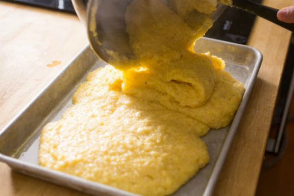 Dok se priprema smjesa potrebno je rernu uključiti na 200 stepeni. U jednu činiju umute se jaja sve dok ne budu blago pjenasta i u njih se dodaje ulje i jogurt, a zatim se smjesa dobro umijesi sa mikserom. Nakon dobijanja homogene smjese dodaje se brašno i palenta sa kašičicom soli i sa praškom za pecivo.