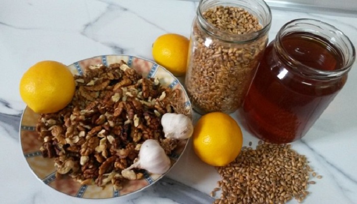 Samljeti pšenicu, orahe i bijeli luk. Dodajte sokove od 15 limuna. Dodajte med i dobro promiješati sa drvenom kašikom i staviti mješavinu u staklenu posudu. Pustite da mješavina odstoji tri dana, a zatim početi jesti.