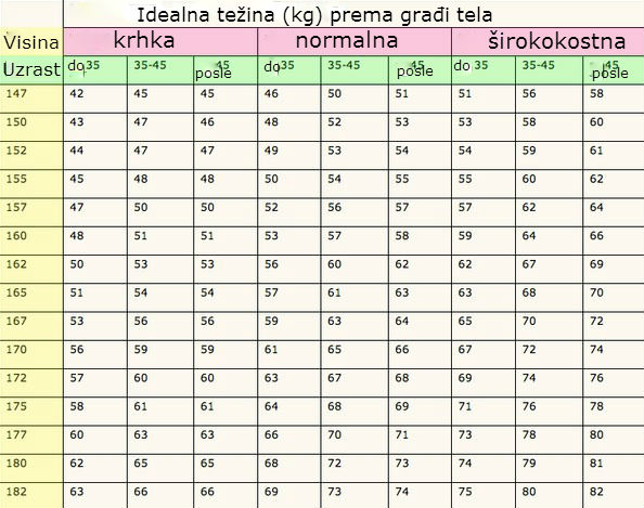 Tabela idealne težine prema uzrastu, visini i građi tijela