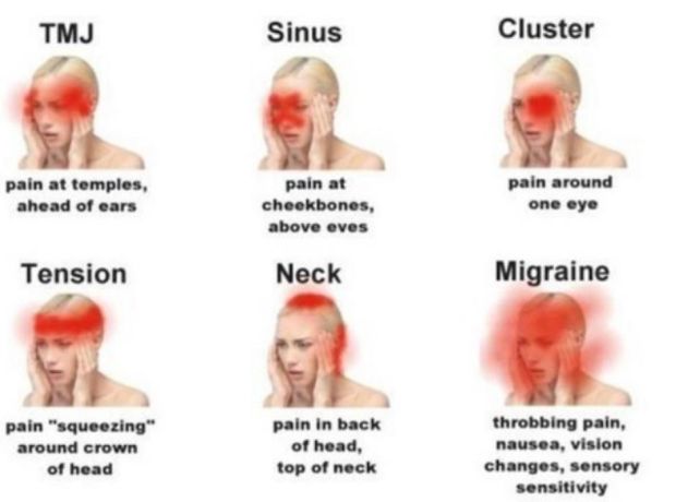 Općenito, liječnici su podijelili glavobolje u šest osnovnih tipova koji se razlikuju po području gdje boli, a prikazani su na slici:
