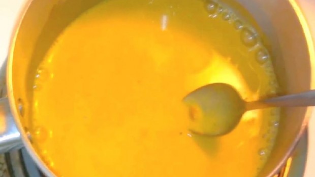 Pomješajte kurkumu sa prvom količinom vode i zagrijte na laganoj vatri dok ne prostruji, mješajte varjačom pa dodajte ostatak vode i promješajte dok se ne ujednači.